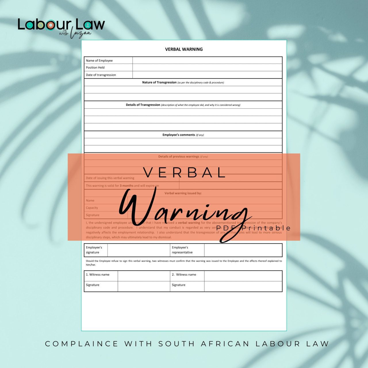 - South African Labour Law Compliant: Aligns with LRA regulations for worry-free verbal warnings.